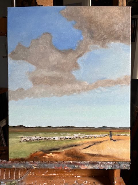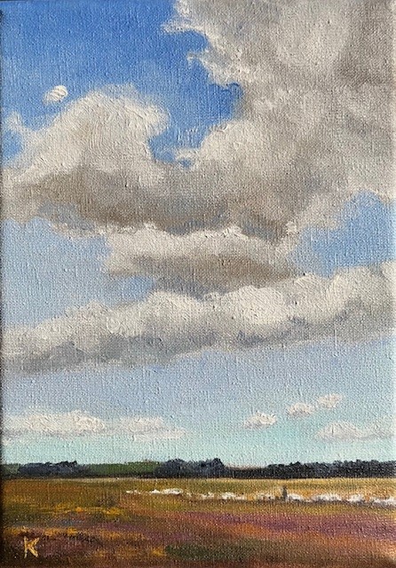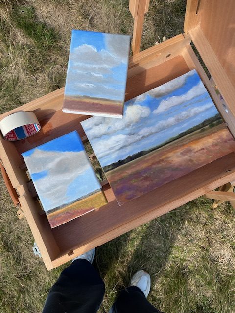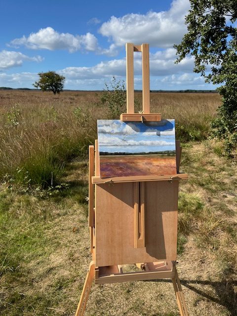 “Schilderen in de buitenlucht zou ik veel vaker willen doen. In de laatste week van september ben ik naar het Dwingelderveld gegaan om hiermee aan de slag te gaan. Het geeft een enorm gevoel van vrijheid om in alle rust en stilte een schilderij te kunnen maken. Het was prachtig weer en hierdoor ontstond er een mooie wolkenlucht waar ik naar op zoek was. De schildersdoeken neem ik weer mee naar mijn atelier om deze daar af te ronden. Uiteindelijke resultaat zal later worden toegevoegd aan de pagina Tekoop / Natuur en Omgeving. Het waren leerzame dagen, en ik ga zeker vaker buiten schilderen, ook in mijn eigen omgeving. “